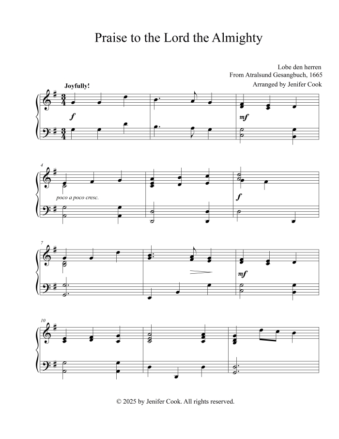 Early intermediate sacred piano solo arranged by Jenifer Cook. 3 pgs. Key of B flat major to C major. Two verses and choruses. This arrangement was written for one of my piano students to play for competition. Some of the phrases will sound similar to my advanced version of Then Sings My Soul. Listen to the video below.
